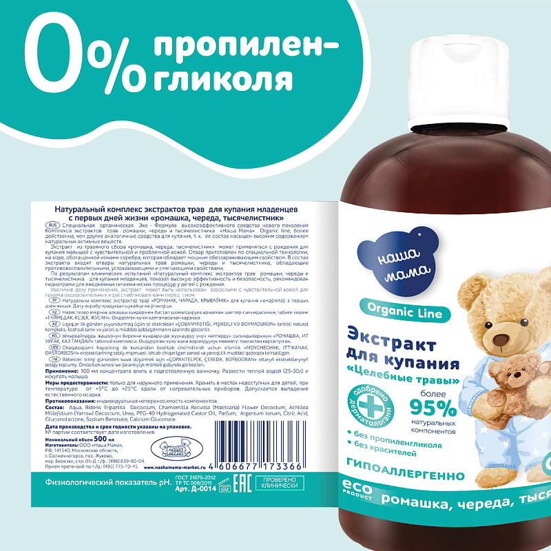 Специальная органическая Эко-Формула высокоэффективного средства нового поколения "Натуральный комплекс экстрактов трав ромашки, череды и тысячелистника "Целебные травы" серии "Наша мама Organic Line", более действенна, чем другие аналогичные средства для купания, т.к. её состав насыщен высоким содержанием натуральных активных веществ. Экстракт травяного сбора из ромашки, череды и тысячелистника может применяться с рождения для купания малышей с чувствительной и проблемной кожей. Отвар приготовлен по специальной технологии, на воде, обогащенной ионами серебра, которая обладает мощным обеззараживающим свойством. В состав экстракта входят отвары натуральных трав ромашки, череды и тысячелистника, обладающие противовоспалительными, успокаивающими и смягчающими свойствами. По результатам клинических испытаний "Натуральный комплекс экстрактов трав ромашки, череды и тысячелистника для купания младенцев", показал высокую эффективность и безопасность, рекомендован педиатрами для ежедневных гигиенических процедур у детей с рождения.