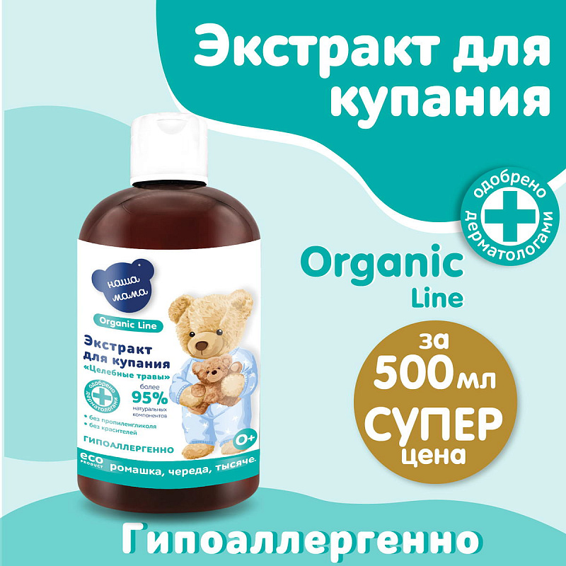 Экстракт трав Наша мама Organic Line для купания младенцев Целебные травы (ромашка, череда, тысячелистник), 500 млНет оценокХарактеристики