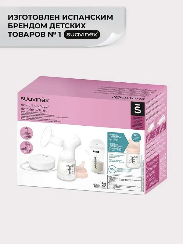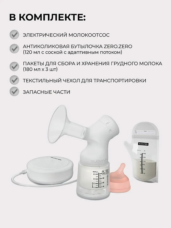 Электрический молокоотсос Suavinex с бутылочкой Zero.Zero и пакетами для сбора молока 302467 begieНет оценокХарактеристики