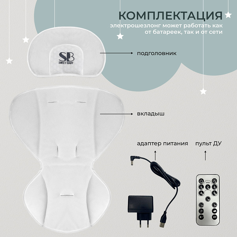 - Работа от сети или батареек. Sweet Baby Matteo Lux способны работать как от адаптера (входит в комплект), так и от 4 батареек типа АА ( в комплект не входят).