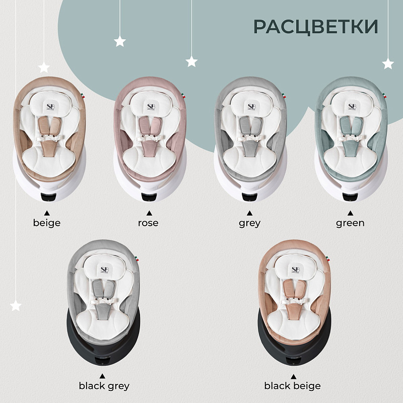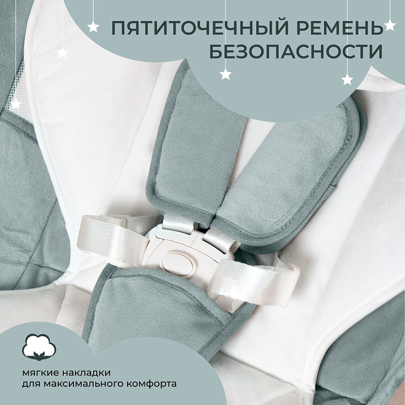 - 5 скоростей укачивания. Пятискоростной режим укачивания подстроится под личные особенности каждого младенца
