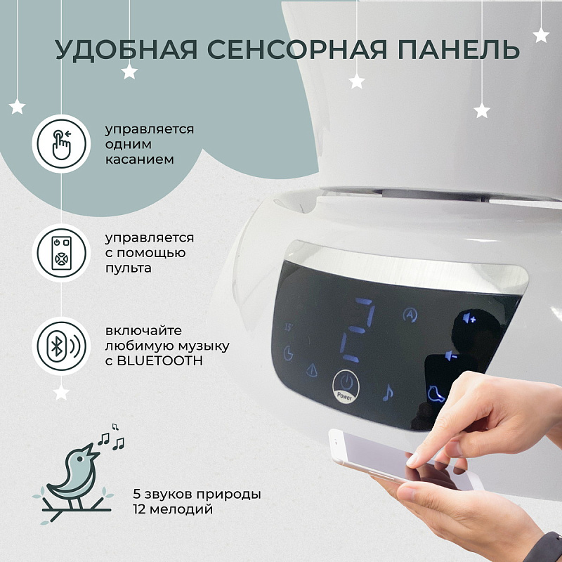 - 12 мелодий и 5 звуков природы. Порадуйте своего малыша веселой песенкой, пением птиц или успокаивающим шумом моря.