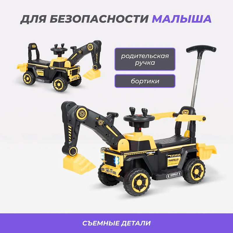 Спецтехника Farfello SR1188 подходит для самых маленьких благодаря родительской ручке, высота которой 86 см, и бортикам безопасности. Когда малыш подрастет, ручку и бортики можно легко снять.