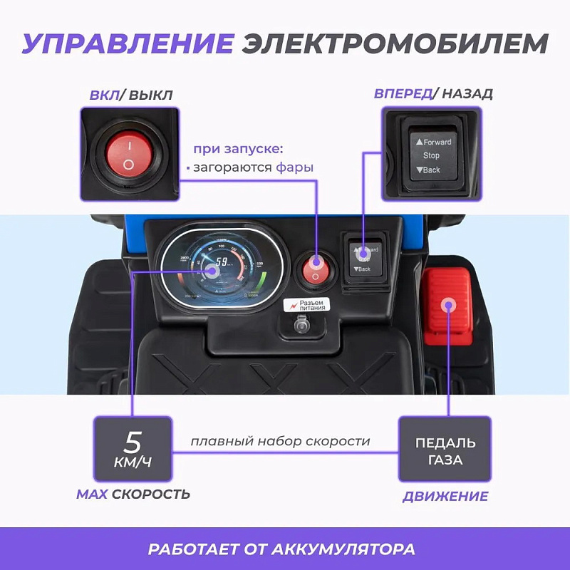 Работает от аккумулятора 6V4,5Ah, что обеспечивает безопасную и долгую работу игрушки. Управление осуществляется с помощью кнопки на панели управления для движения вперед и назад, а движение активируется педалью газа на подножке. Таким образом, малыш легко и уверенно сможет управлять этим электромобилем.