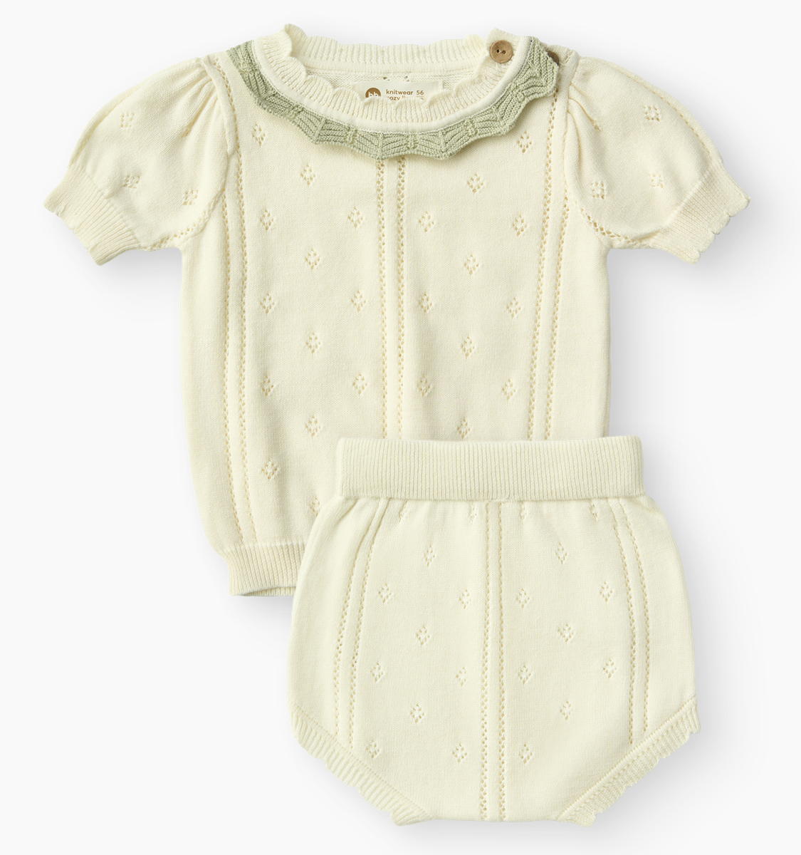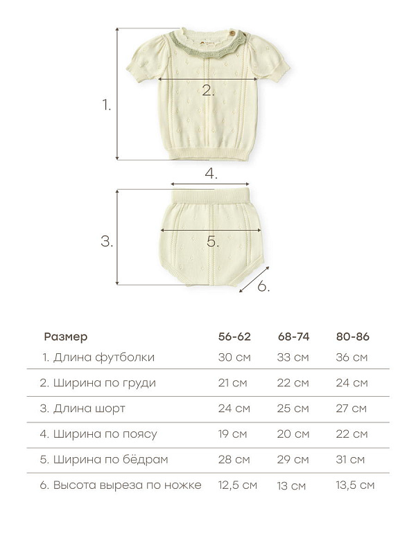 Летний костюм для новорожденных детей, состоящий из свободной футболки и удобных шорт, станет идеальным выбором для летнего времени года. Комплект одежды создан из мягкой хлопковой ткани, которая обеспечивает комфорт при носке и позволяет коже дышать даже в жаркую погоду. Так что нежная кожа младенца не запреет, что особенно важно в переменчивую весеннюю погоду.. У горловины предусмотрены пуговицы, облегчающие молодым родителям процесс переодевания ребенка. В шортах учтено пространство под подгузник. Набор выполнен в базовых однотонных цветах, так что подойдет и для мальчика и для девочки. Милый вязаный дизайн с рукавами - фонариками будет отлично смотреться на семейных фотосессиях.