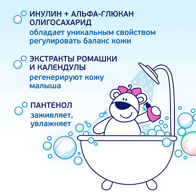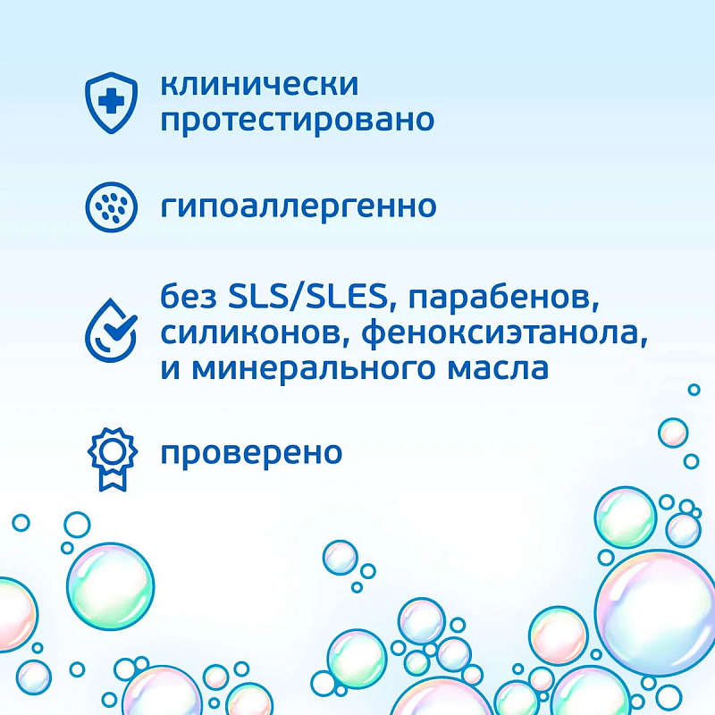 Уникальный состав с полезным пребиотиком (инулином) и натуральными экстрактами ромашки, календулы и лаванды обеспечивает мягкое очищение и надежную защиту природных функций кожи, и способствует поддержанию естественного pH-баланса.