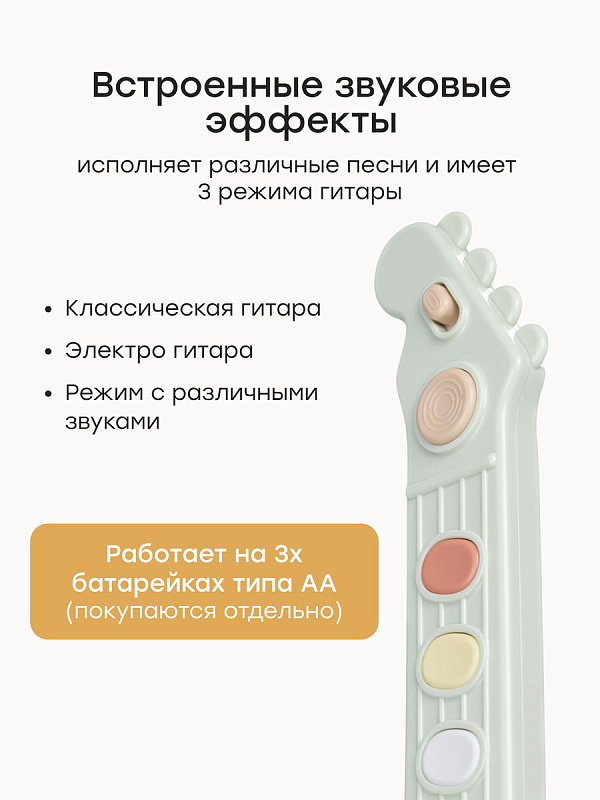 Развитие навыков - взаимодействие со струнами и кнопками помогает ребёнку тренировать координацию движений, внимание и мелкую моторику. Игрушка работает как полноценная развивающая музыкальная гитара для детей.