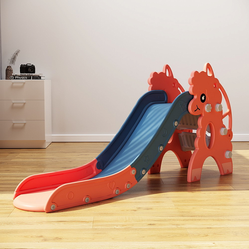 Горка для домашнего использования изготовлена из пластика. Специального крепления к земле не имеет. Легкая и быстрая сборка.