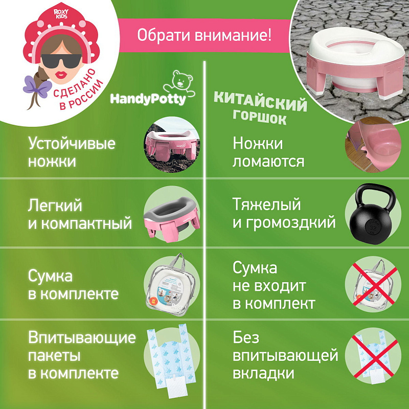 Дорожный горшок для детей HandyPotty поможет обеспечить дополнительный комфорт в путешествиях с маленькими детьми. Это простое приспособление сочетает в себе функции трех аксессуаров: обычного горшка, дорожного горшка и адаптера для унитаза, что делает горшок HandyPotty универсальным. В комплекте с этой моделью поставляется многоразовая вкладка: теперь её не нужно покупать отдельно.