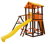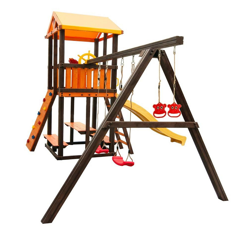 В набореигровой домик, столик, лавочка - 2 шт, лестница, скат, ручка пластиковая - 2 шт, А-опция, качели "Лодочка" 2 шт, кольца "Микки", штурвал "Шторм", бинокль "Капитан", скалодром маленький