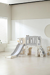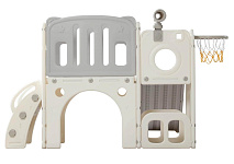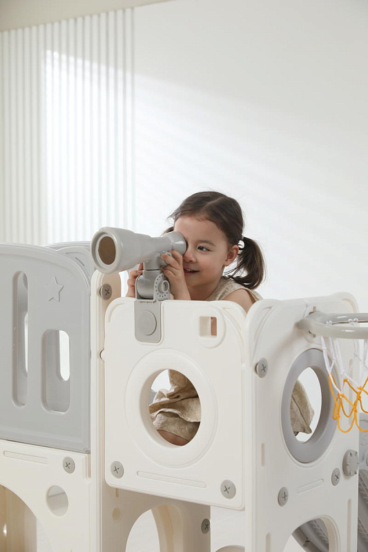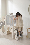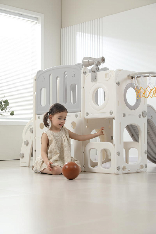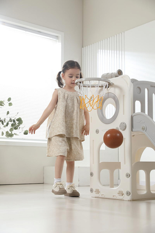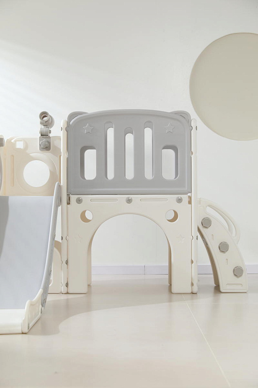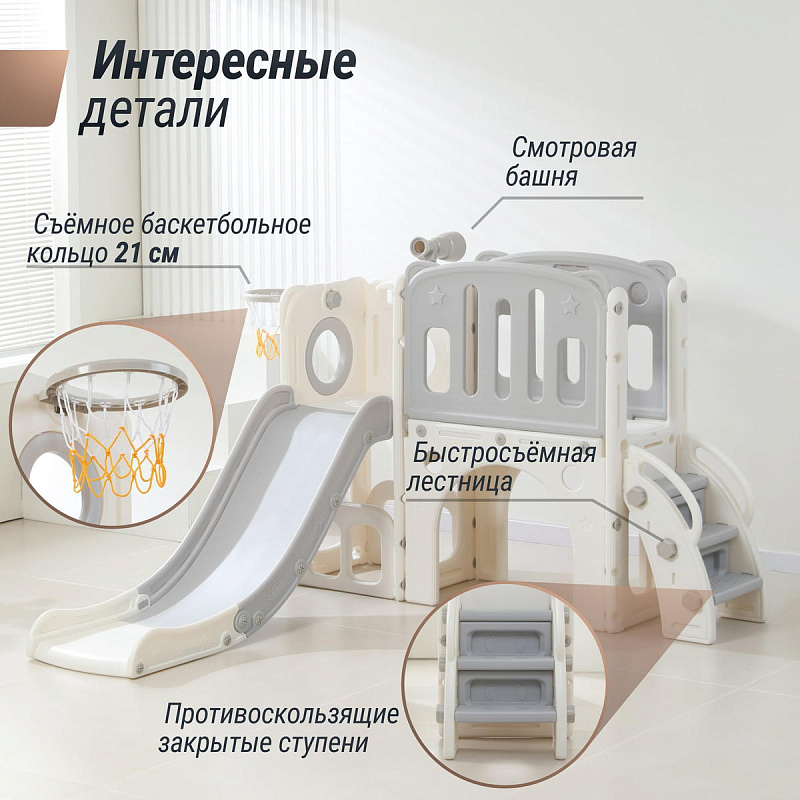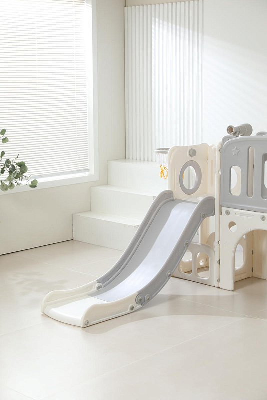 Детский комплекс выполнен в минималистичном дизайне с применением высококачественного пищевого пластика. Отсутствие выделяемых токсичных веществ, стойкость к воздействию ультрафиолета и полная гипоаллергенность материала обеспечивают безопасность и комфорт в процессе эксплуатации. Конструкция характеризуется эргономичными формами, включая сглаженные углы и покрытие, исключающее риск травмирования.