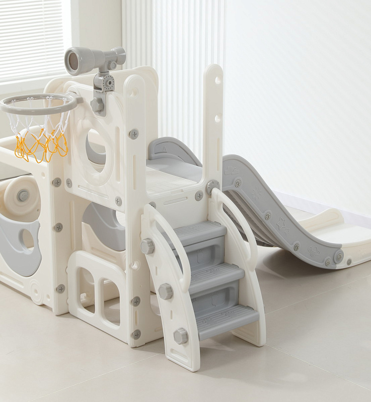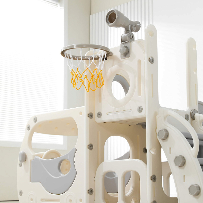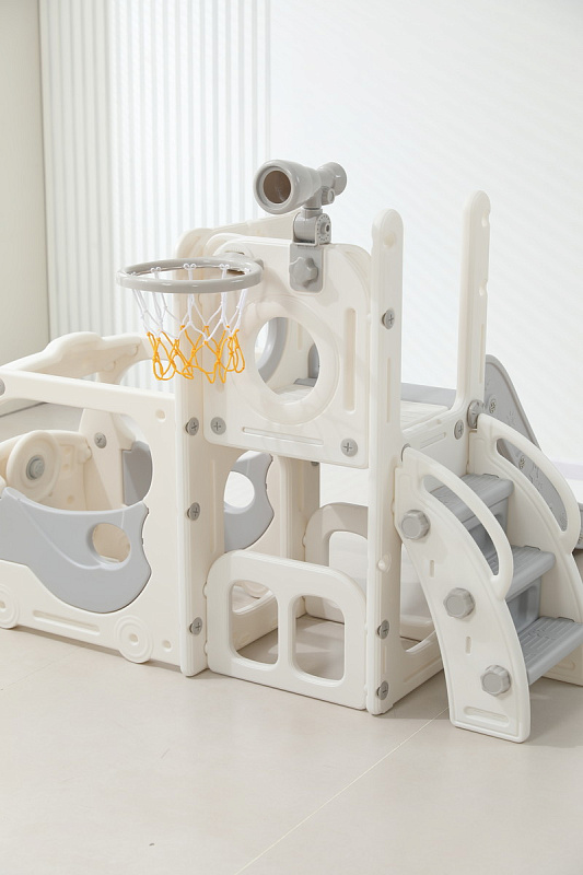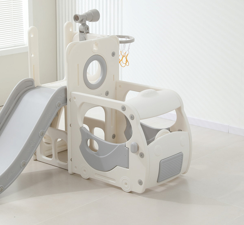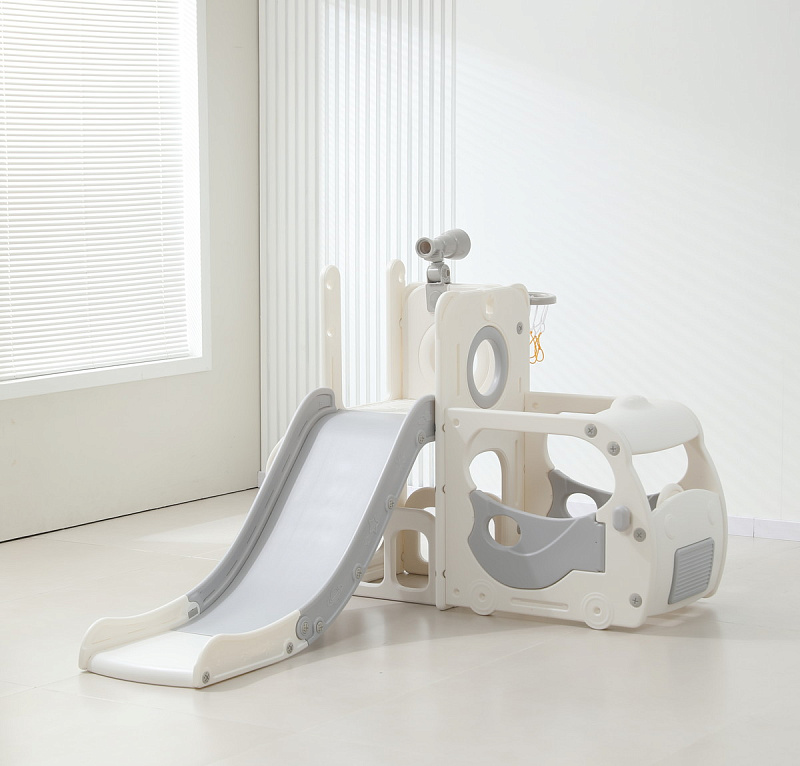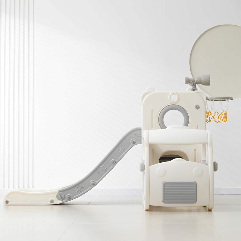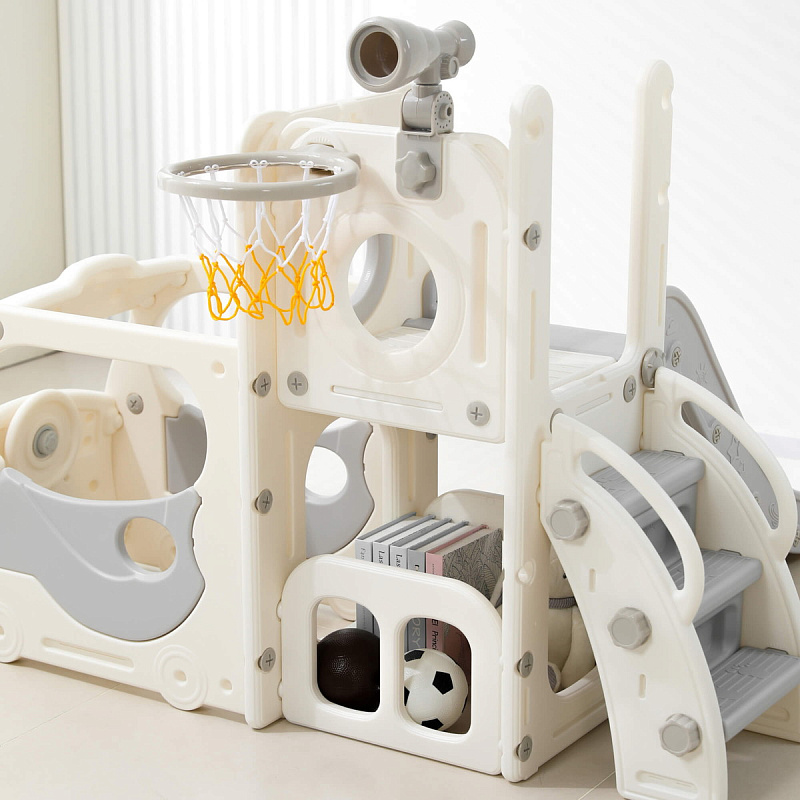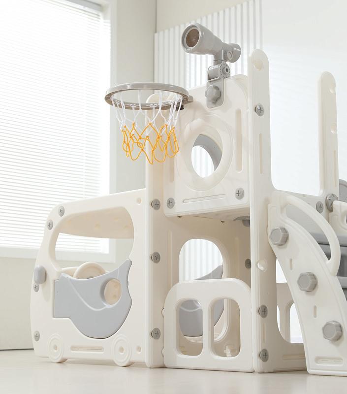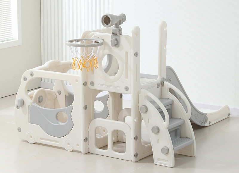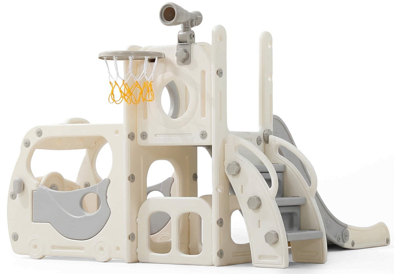 Спортивный игровой комплекс включает увлекательные элементы: пластиковую горку с гладким покрытием для комфортного спуска, машину с рулем, баскетбольное кольцо, которое способствует тренировке меткости и координации движений и подзорную трубу, позволяющую детям фантазировать, представлять себя исследователями, открывающими новые горизонты и приключения. Все детали домашней горки для катания и машинки изготовлены с закругленными краями, исключающими риск повреждений.