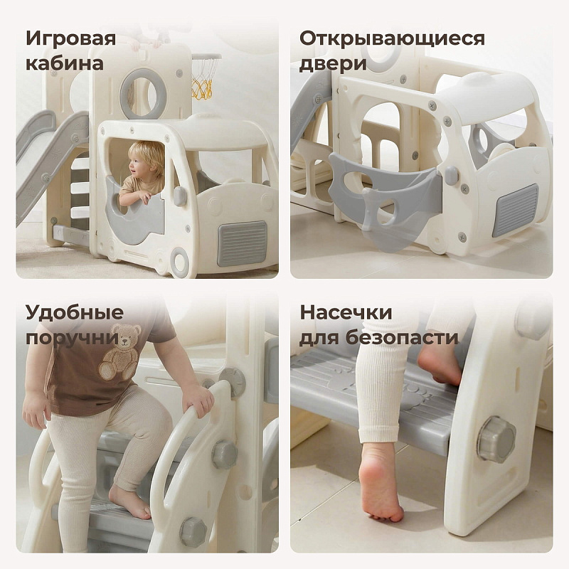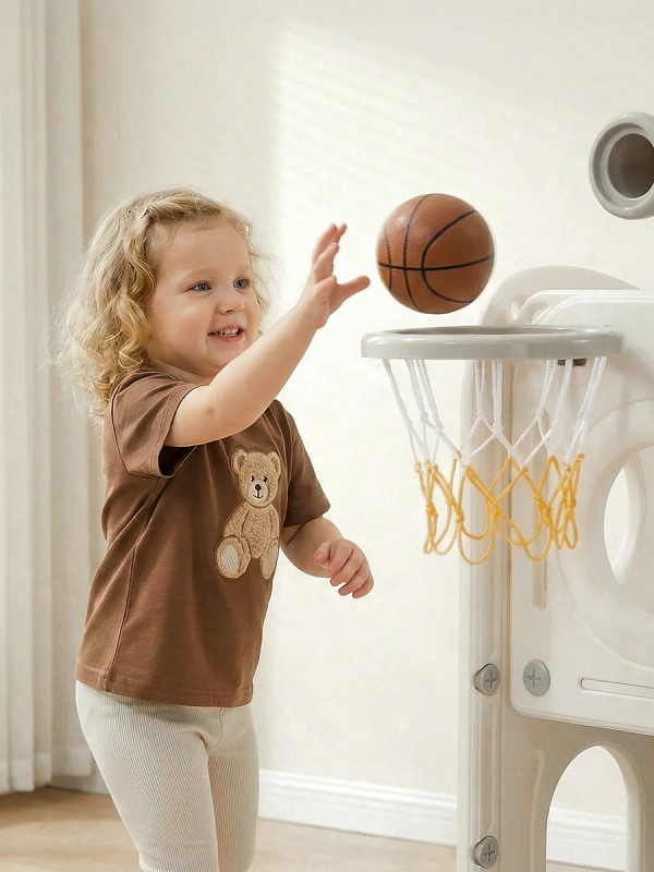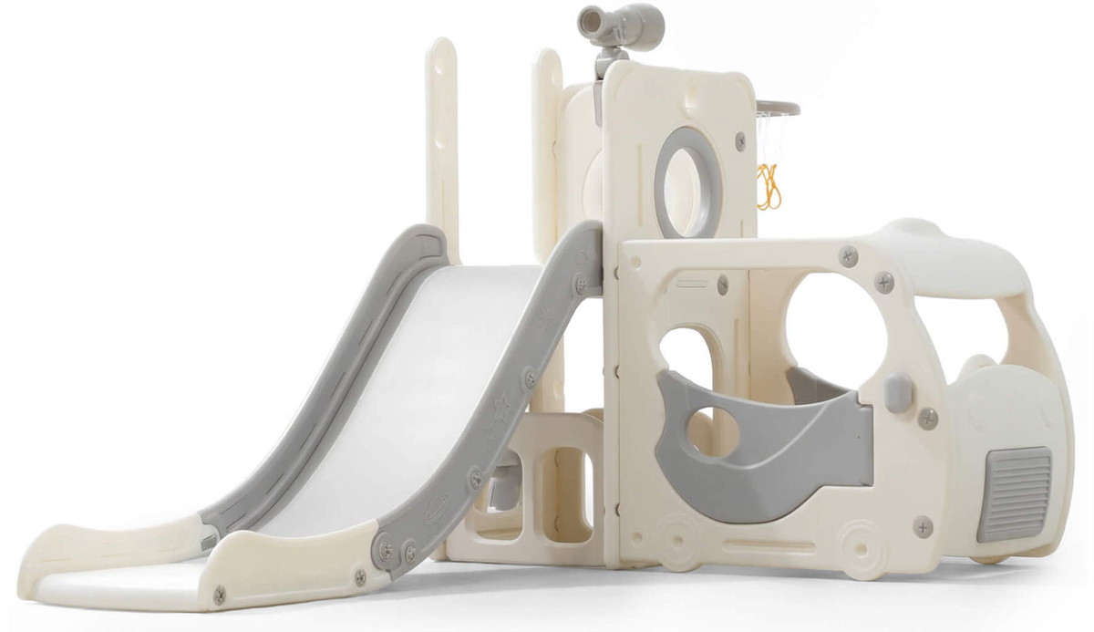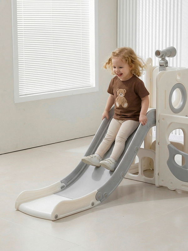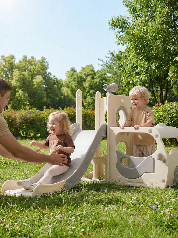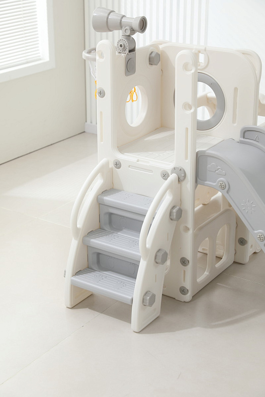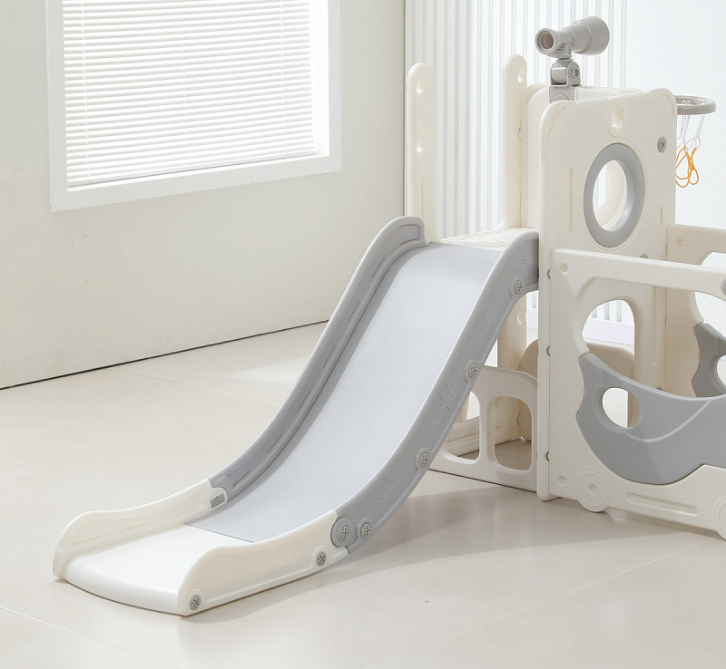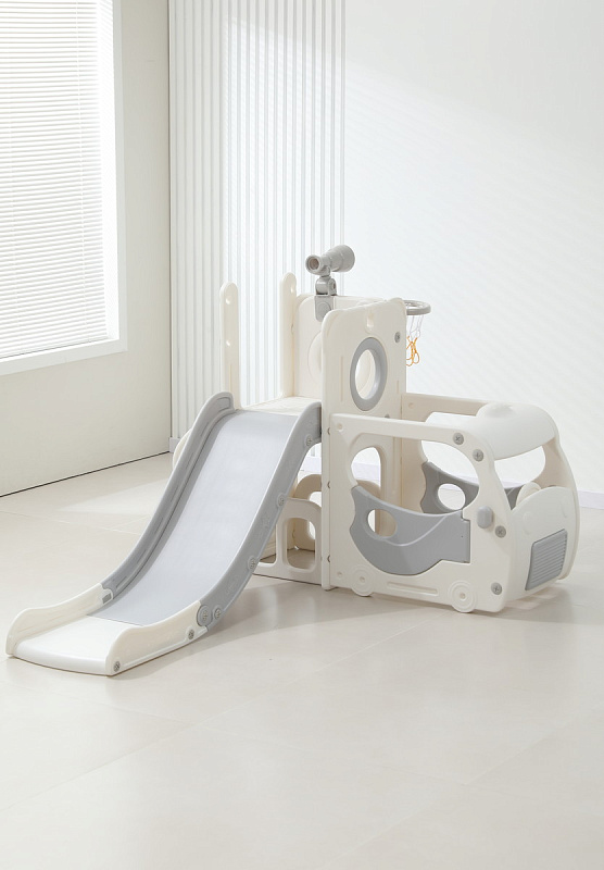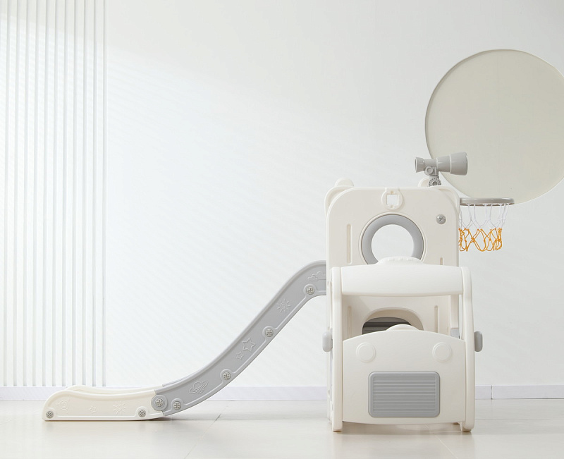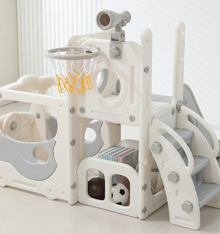Спортивный игровой комплекс включает увлекательные элементы: пластиковую горку с гладким покрытием для комфортного спуска, машину с рулем, баскетбольное кольцо, которое способствует тренировке меткости и координации движений и подзорную трубу, позволяющую детям фантазировать, представлять себя исследователями, открывающими новые горизонты и приключения. Все детали домашней горки для катания и машинки изготовлены с закругленными краями, исключающими риск повреждений.