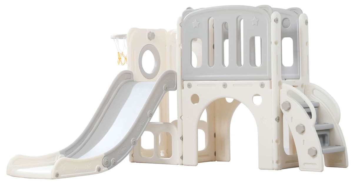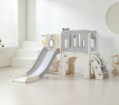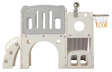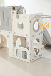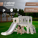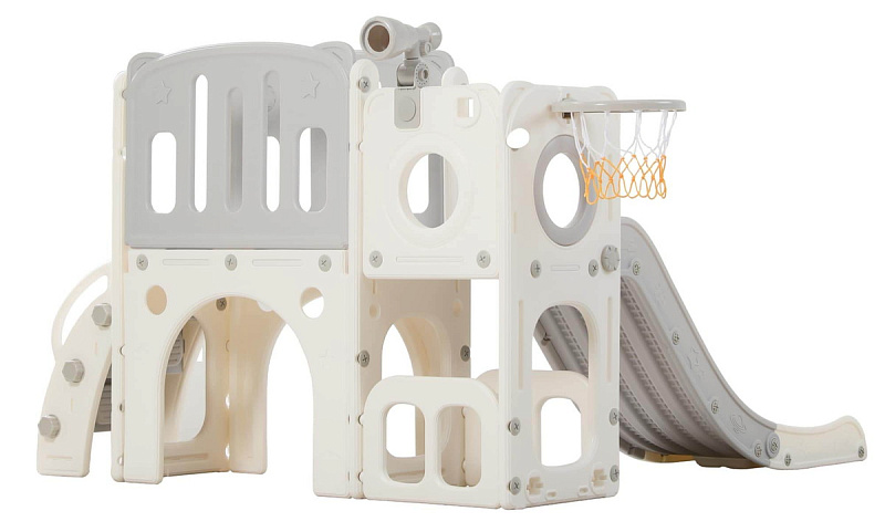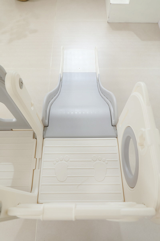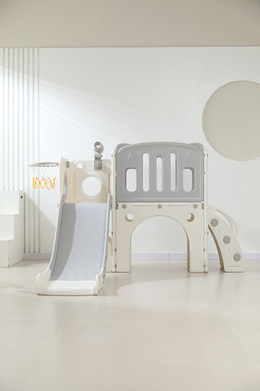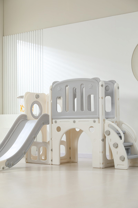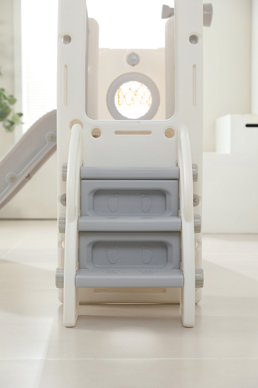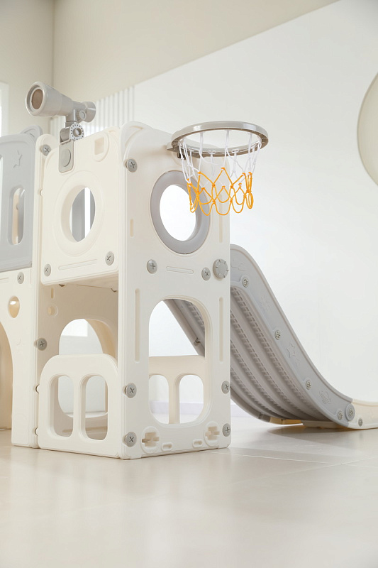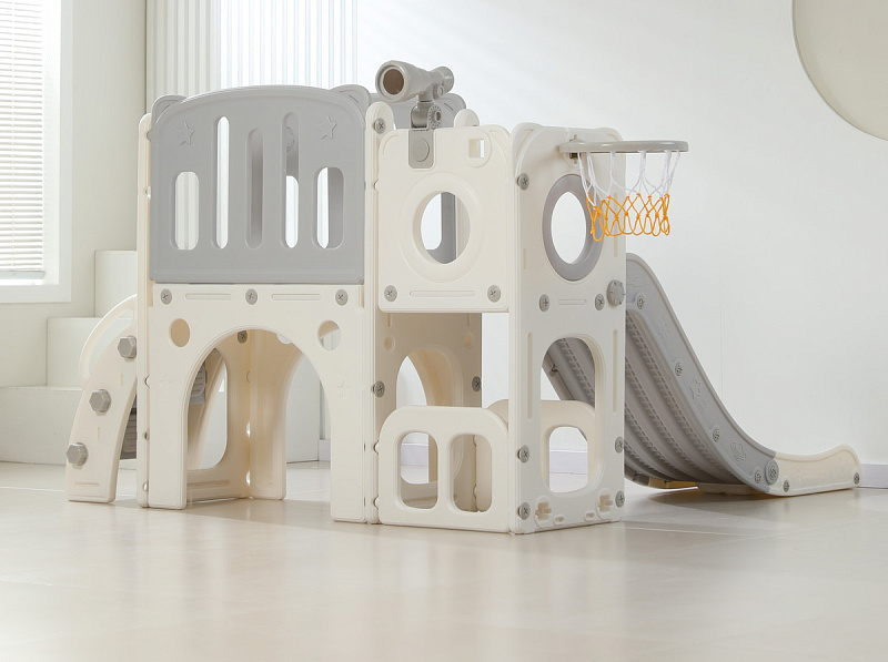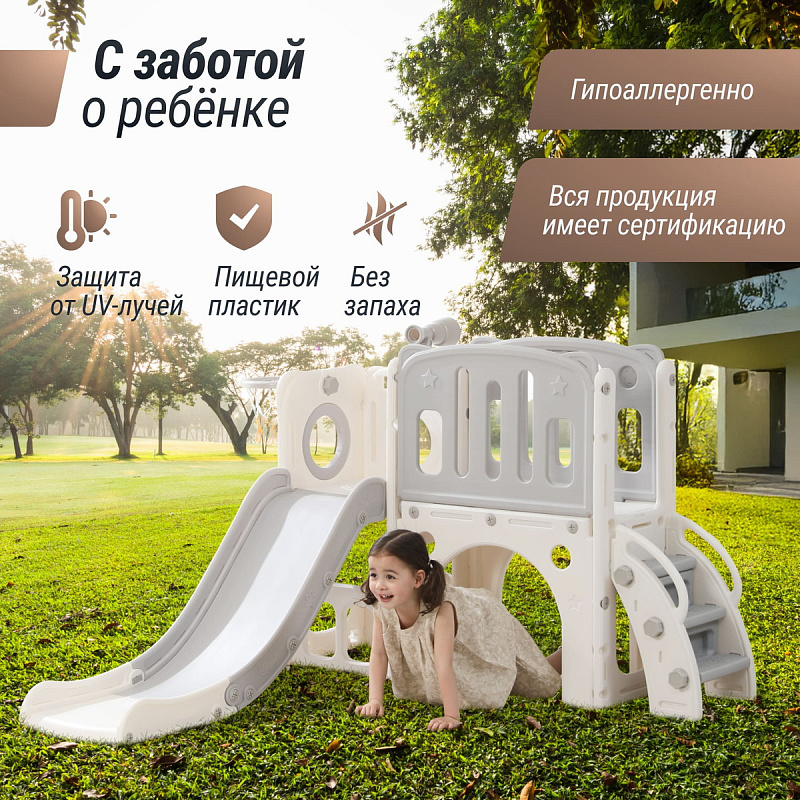 Детский комплекс выполнен в минималистичном дизайне с применением высококачественного пищевого пластика. Отсутствие выделяемых токсичных веществ, стойкость к воздействию ультрафиолета и полная гипоаллергенность материала обеспечивают безопасность и комфорт в процессе эксплуатации. Конструкция характеризуется эргономичными формами, включая сглаженные углы и покрытие, исключающее риск травмирования. Максимальная нагрузка на комплекс 70 кг.