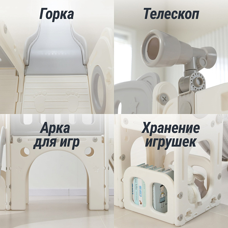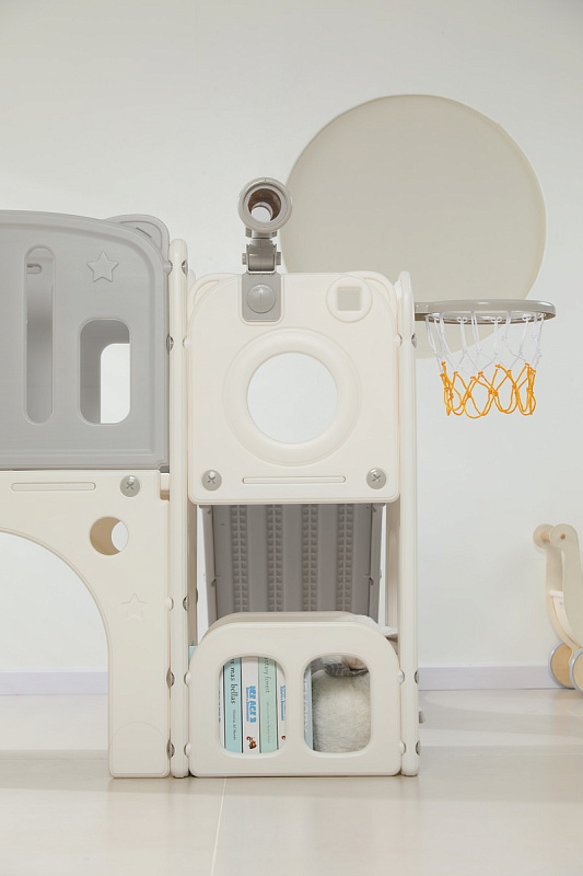 - Дополнительные аксессуары, такие как съемное баскетбольное кольцо диаметром 21 см, подвижный телескопический элемент и удобные отделения для хранения инвентаря.