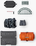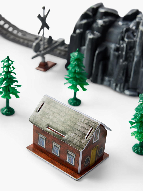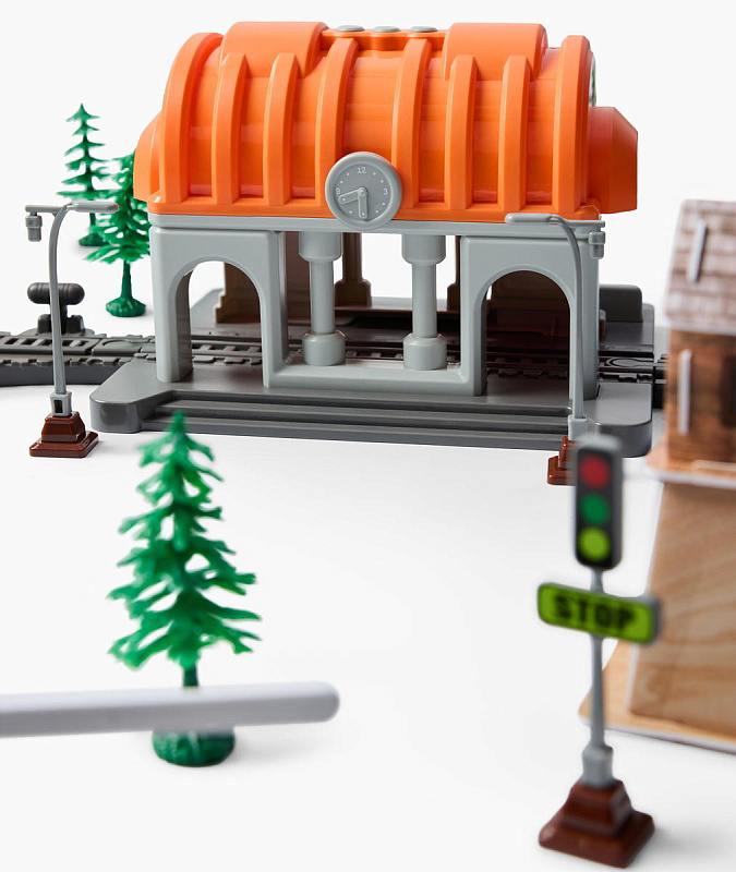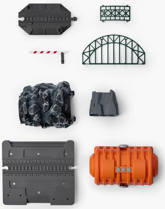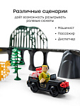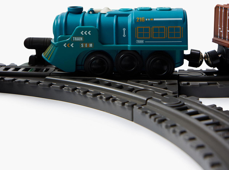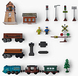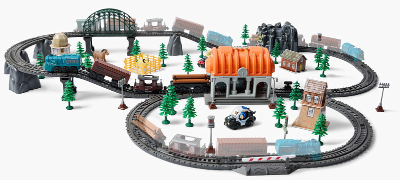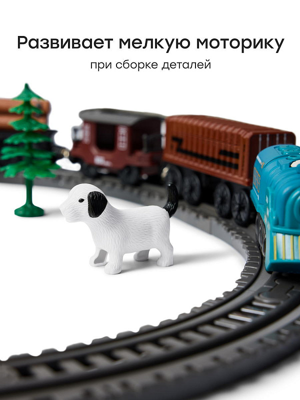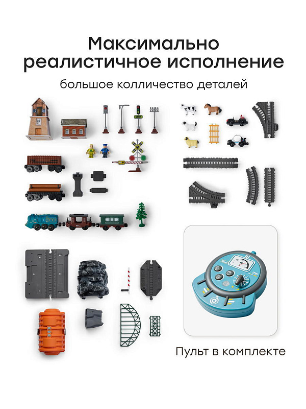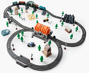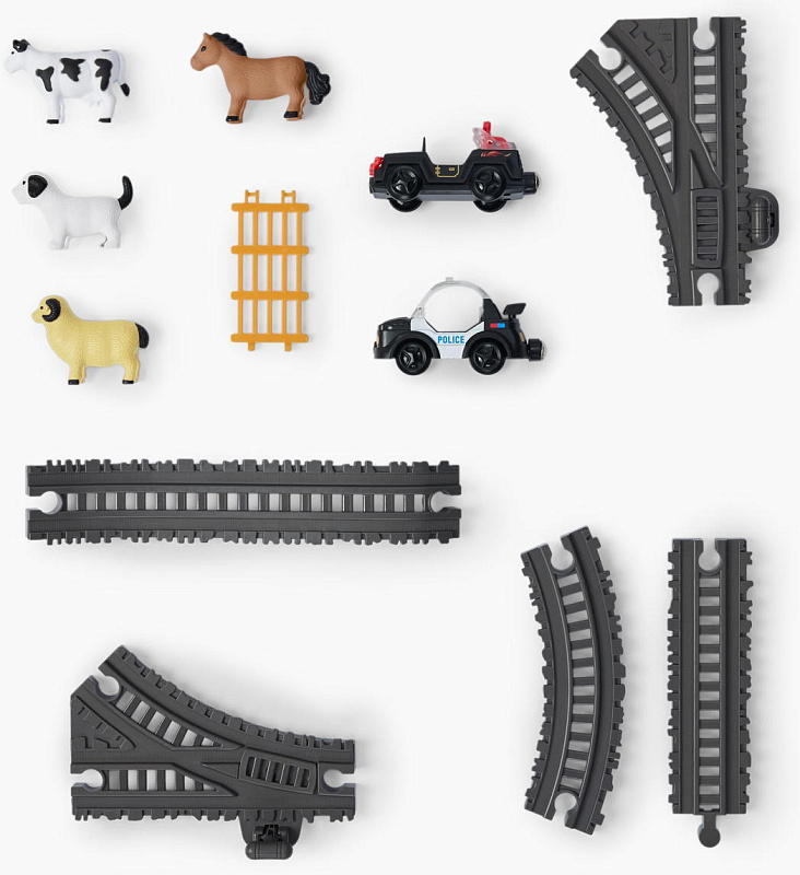 В набореПульт - 1 шт., рельсы - 23 шт., крепления для рельсов - 20 шт., поезд - 1 шт., вагон - 4 шт., животные - 4 шт., машинки - 2 шт., человечки - 2 шт. прочие детали - 71 шт.