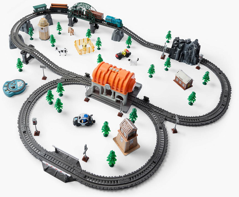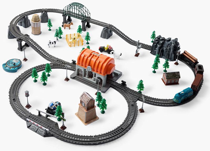Комплектации Пульт - 1 шт., рельсы - 23 шт., крепления для рельсов - 20 шт., поезд - 1 шт., вагон - 4 шт., животные - 4 шт., машинки - 2 шт., человечки - 2 шт. прочие детали - 71 шт..