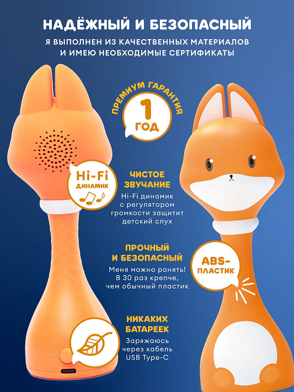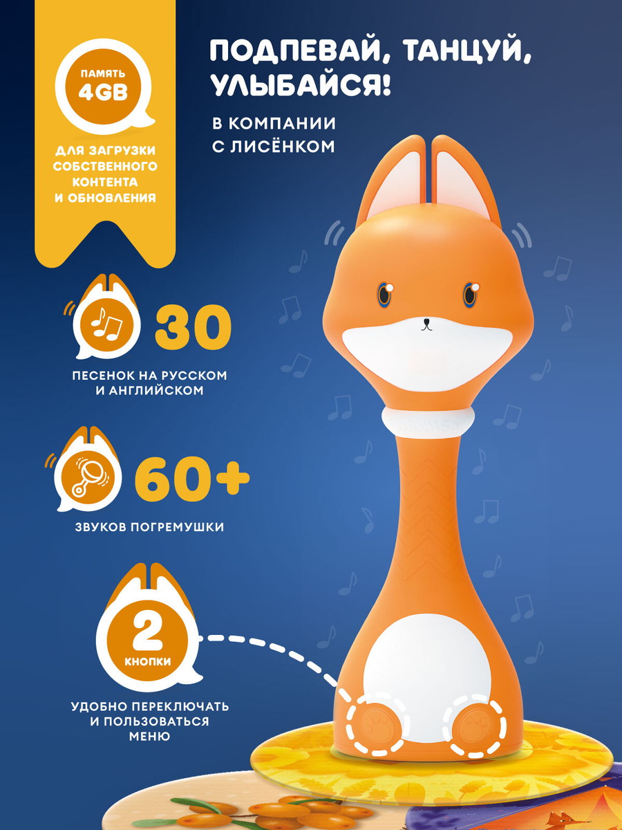 Во-первых, я всё-таки лисёнок. Во-вторых, меня придумали и нарисовали в Санкт-Петербурге. В-третьих, две кнопки, чтобы с удобством переключать контент и пользоваться меню. В-четвёртых, я обладатель замечательной памяти: целых 4 Гб! В-пятых, любовь к говорению: с удовольствием озвучиваю картинки с карточек и карт из комплекта, которые одновременно обучают и развлекают.