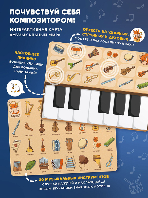 Карты «Дом Лисёнка» и «Музыкальный мир». Ставьте меня на красочные иллюстрации, а я буду рассказывать про свой домик, друзей, особенности леса и проигрывать звуки музыкальных инструментов. Миксуйте, комбинируйте, составляйте полноценные мелодии!