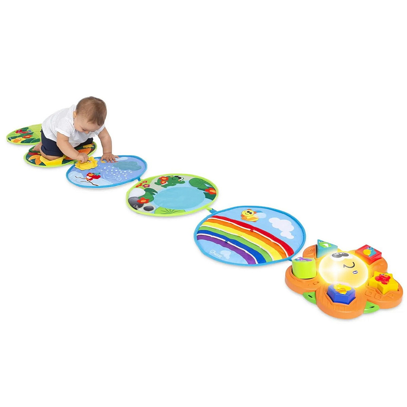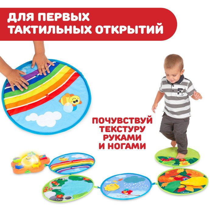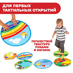 - 5 тканевых дисков (4 сезона и 1 радуга): каждый диск характеризуется особой поверхностью, которая помогает ребенку развить определенные навыки. С дисками можно создать более 10 конфигураций
