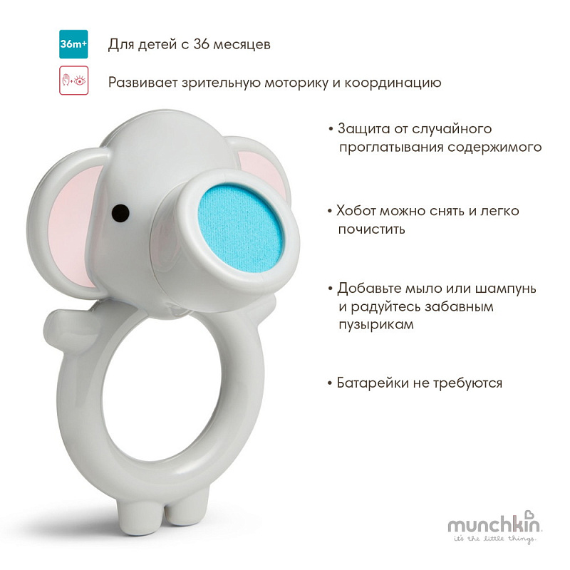 Просто намочите хоботок слоника, добавьте мыло или шампунь и подуйте, чтобы создать волшебный поток забавных пузырей! А главное, что, благодаря правильному устройству игрушки, малыш не сможет проглотить мыло или пузыри, играя в ванне. Корпус игрушки выполнен в виде кольца, поэтому любому ребенку будет удобно держать её. Игрушка развивает зрительную моторику и координацию, а также учит малыша устанавливать причинно-следственные связи. Батарейки и другие электронные элементы не требуются.
