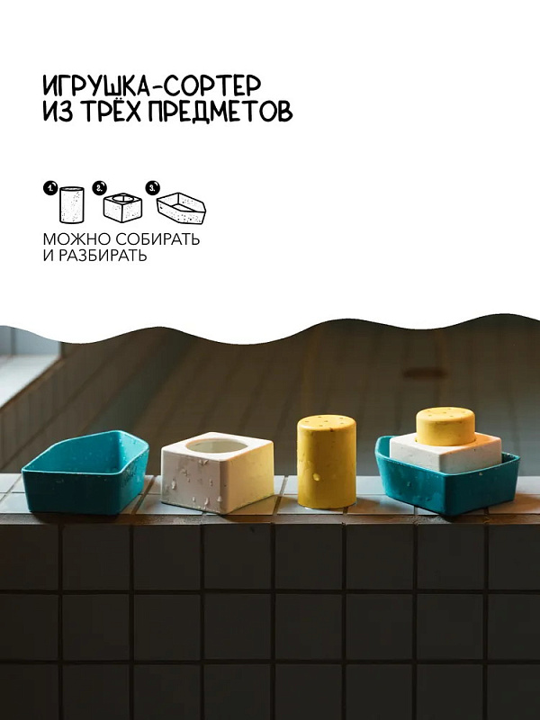 Кораблик состоит из трёх частей: лодочки, куба и яркого оранжевого стаканчика с отверстиями для игр с водой. С элементами можно играть по отдельности или собрать вместе в один кораблик — конструкция отлично держится на плаву.