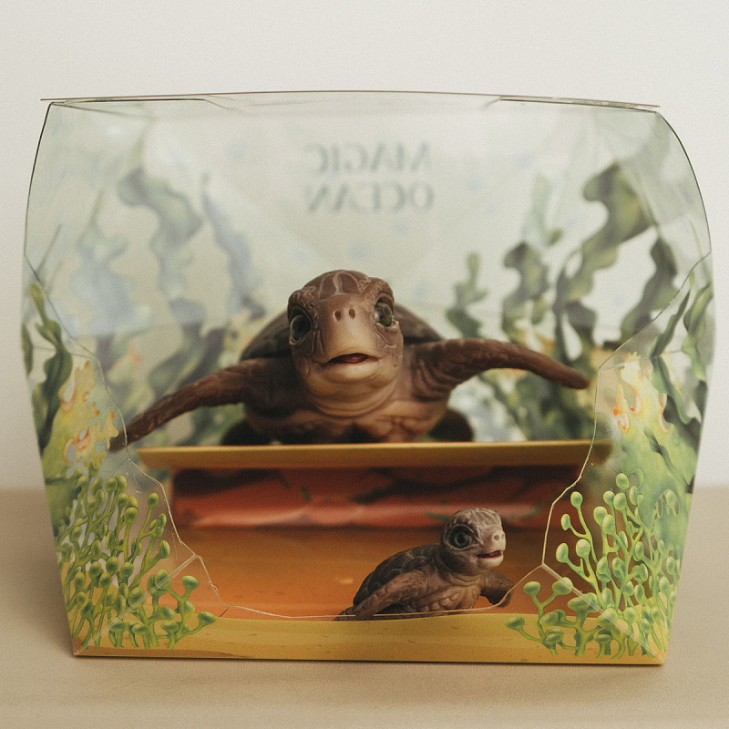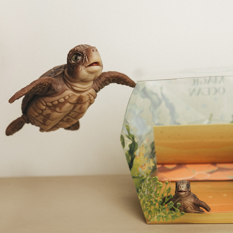 На тёплом мелководье мама-черепаха мягко подталкивает малыша к первому заплыву — спокойные движения и любопытные взгляды создают ощущение живой сцены из океана. Компактный дуэт легко помещается на ладони и моментально настраивает на добрую игру.