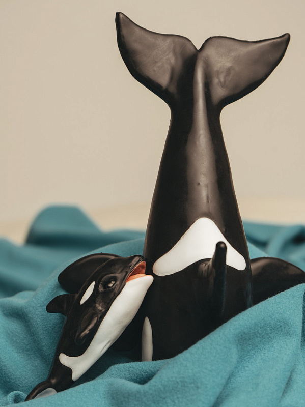 Игрушка поставляется в подарочной коробке, превращая знакомство в особый момент. Платиновый силикон и ручная роспись подчёркивают образ и делают каждый экземпляр неповторимым. Косатка с малышом — готовый презент, символ семьи, заботы и силы океана.