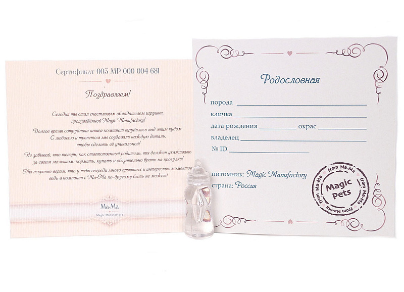 Комплектация: соска-кость, паспорт животного, карточки по уходу
