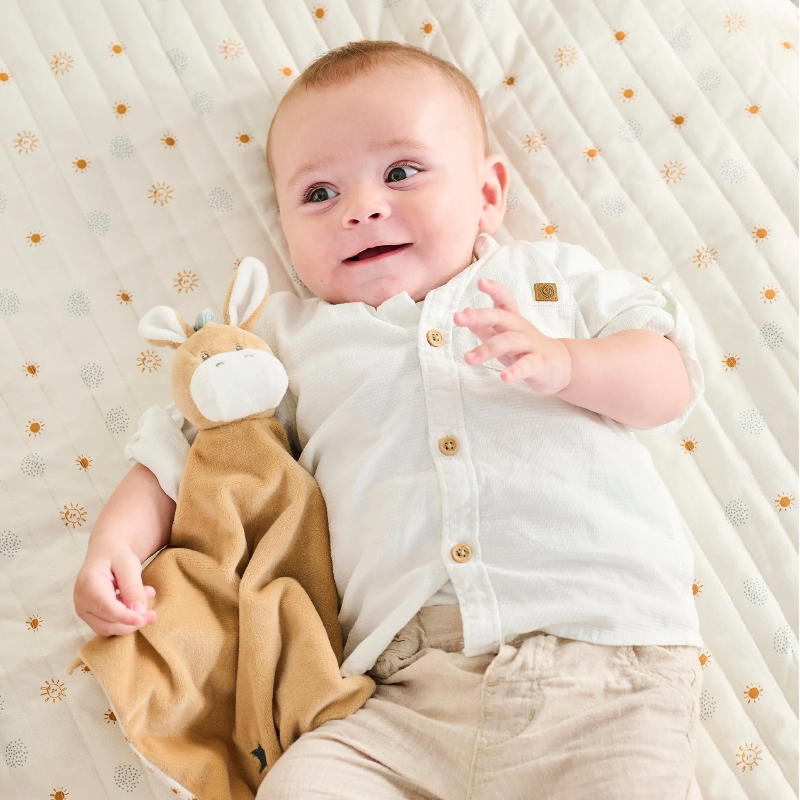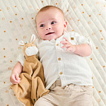 - идеально подходит для новорождённых, станет постоянным другом для малыша дома в кроватке или в коляске на прогулке;