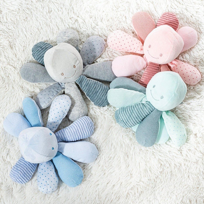 Мягкая игрушка в виде забавного осьминога с восьмью щупальцами c различными текстурами.