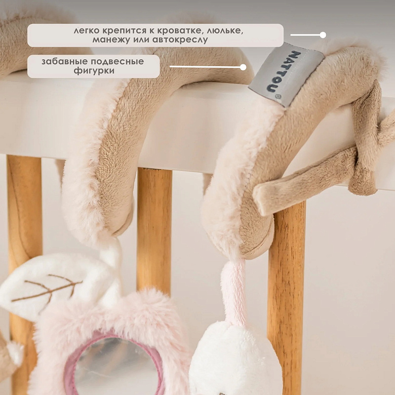 Легко крепится к манежу, кроватке или автокреслу с помощью лент.