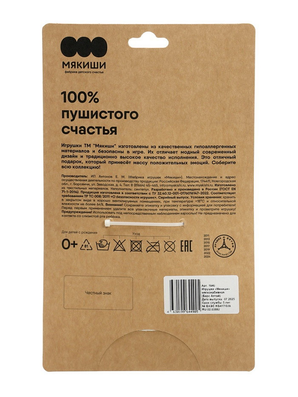 Мягкая игрушка "Мякиши" изготовлена из высококачественного искусственного меха, что обеспечивает ей долгий срок службы и комфорт при использовании.