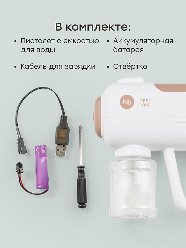 В наборепистолет с емкостью для воды - 1 шт., аккумуляторная батарея - 1 шт., кабель для зарядки - 1 шт. отвёртка - 1 шт.
