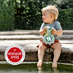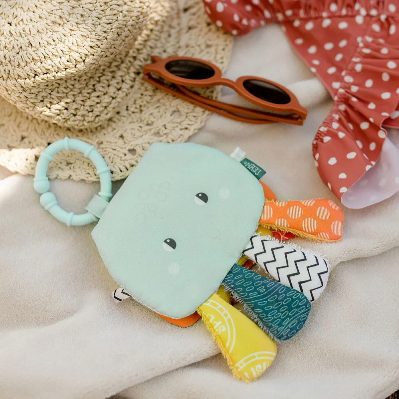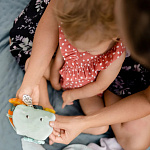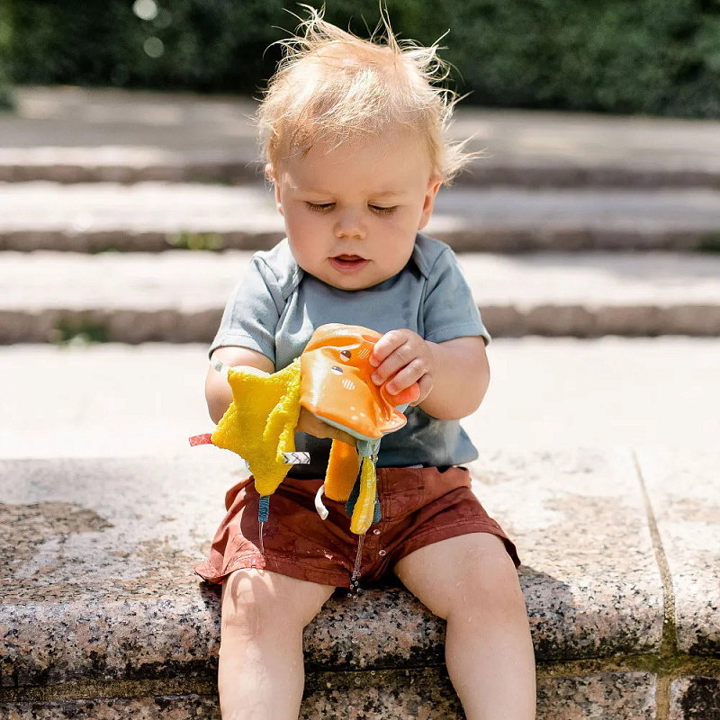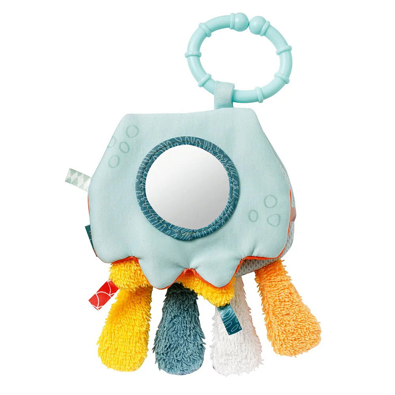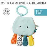 Красочная книжка в виде забавного осьминога выполнена из водонепроницаемого неопрена и подходит для игр во время купания. За удобное колечко её можно подвесить в манеж, кроватку, коляску или прицепить к развивающему коврику.
