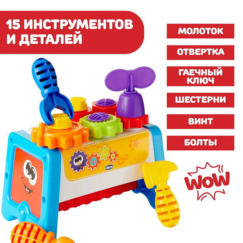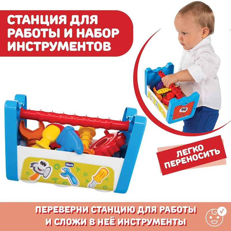 Игрушка-конструктор от Chicco симулирует раннее развитие детей в частности: ассоциации, причинно-следственные связи и моторику! Набор состоит из самой скамьи-коробки для хранения инструментов и запчастей и 13 различных предметов, таких как молоток, отвертка, гаечный ключ, винты, шестерни, болты, с которыми можно играть.
