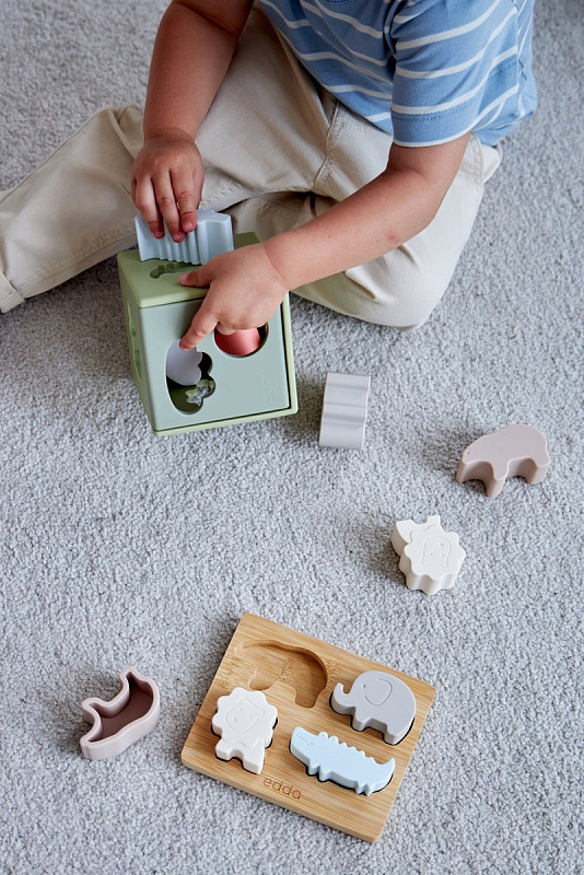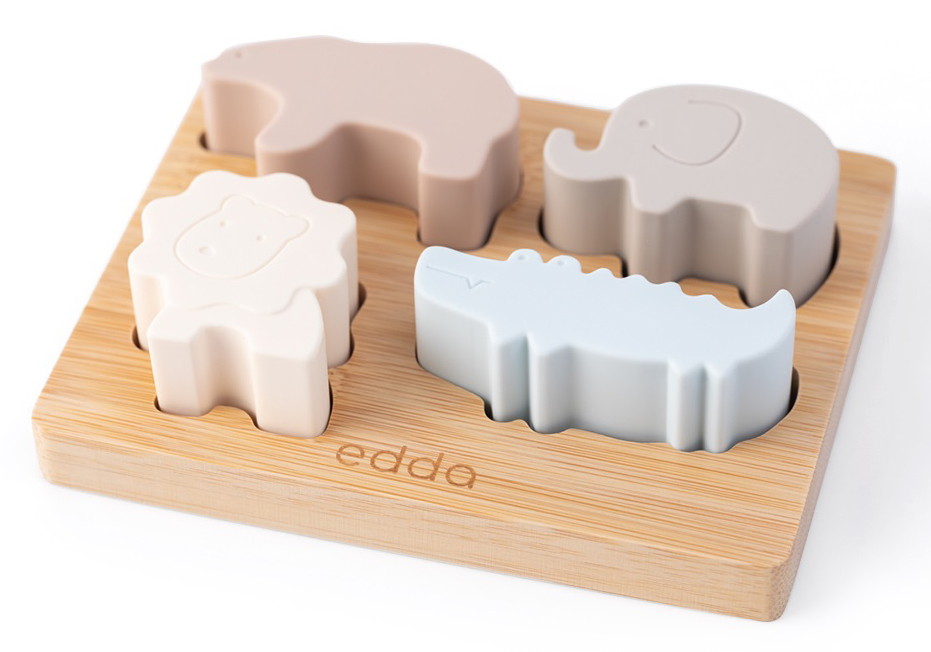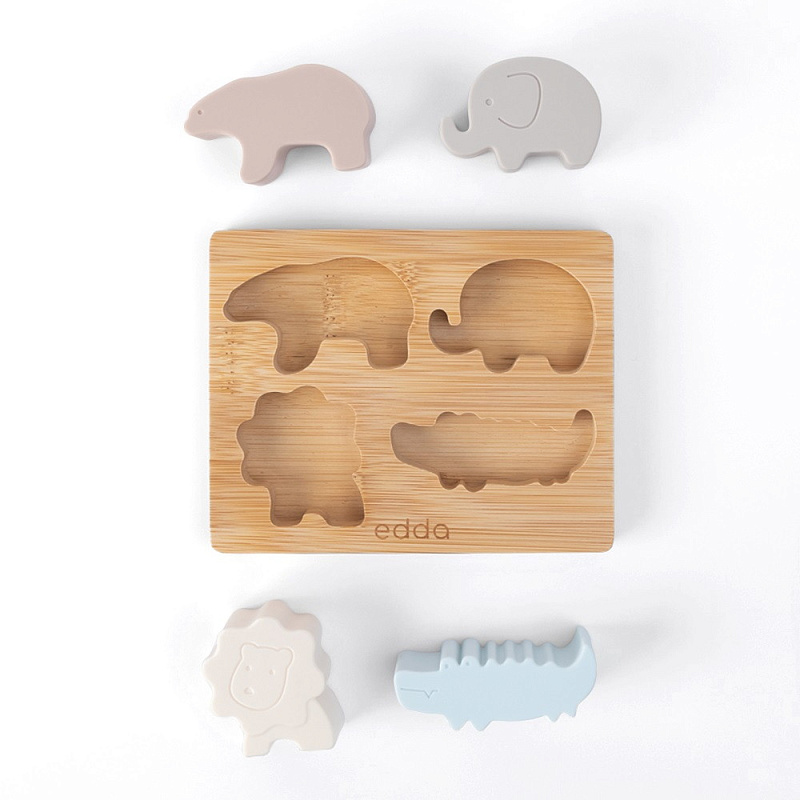 Игровой набор «Зверята» состоит из деревянной платформы и четырёх силиконовых игрушек в виде зверей: пусть малыш попробует найти каждому животному своё место! Занятия с игрушкой-пазлом развивают логику и фантазию, внимание и память, благоприятно воздействуют на нервную систему детей. Малыши тренируют усидчивость и знакомятся с предметами по признакам: форме, цветы и размеру. Фигурки зверей можно использовать в качестве отдельных игрушек. Зверят удобно держать в детской ладошке благодаря эргономичной форме и выверенным размерам.