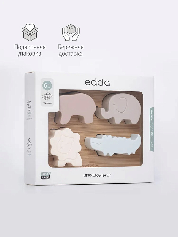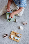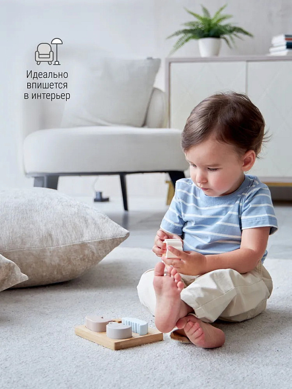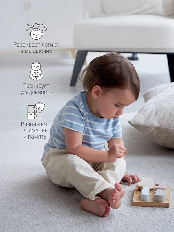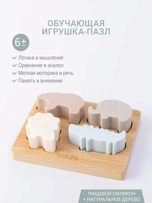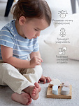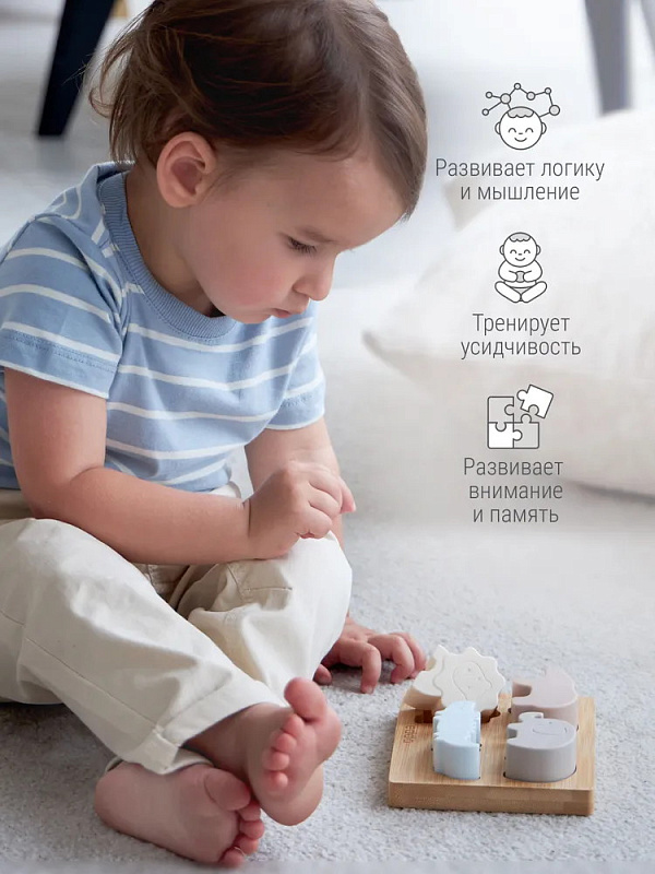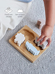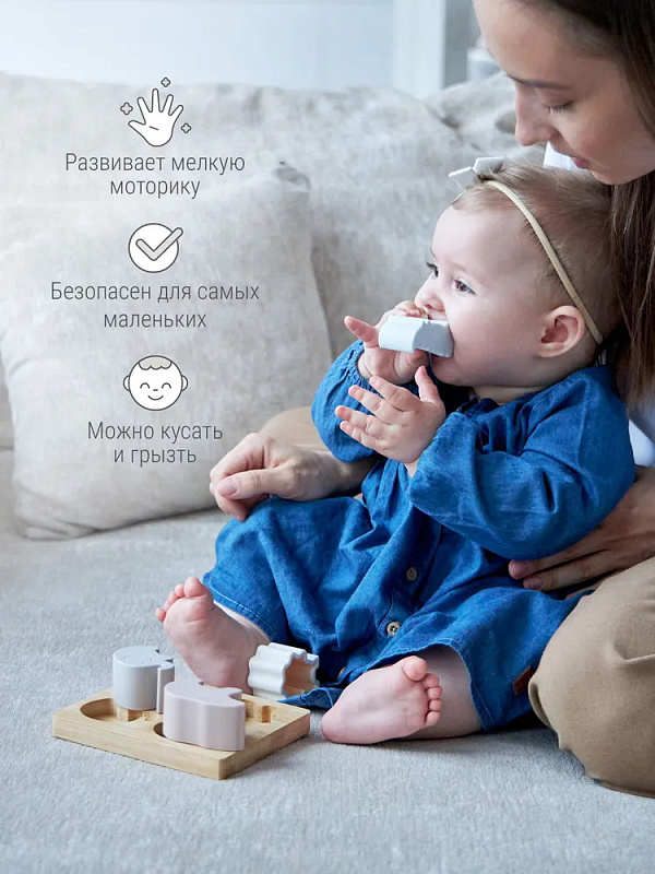 Пазл безопасен для самых маленьких: он изготовлен из натурального бамбука и гипоаллергенного пищевого силикона, его края и уголки – сглаженные и мягкие. Нежные оттенки игрушек гармонично впишутся в интерьер любой детской комнаты.