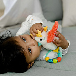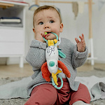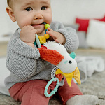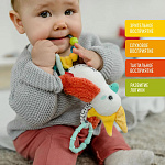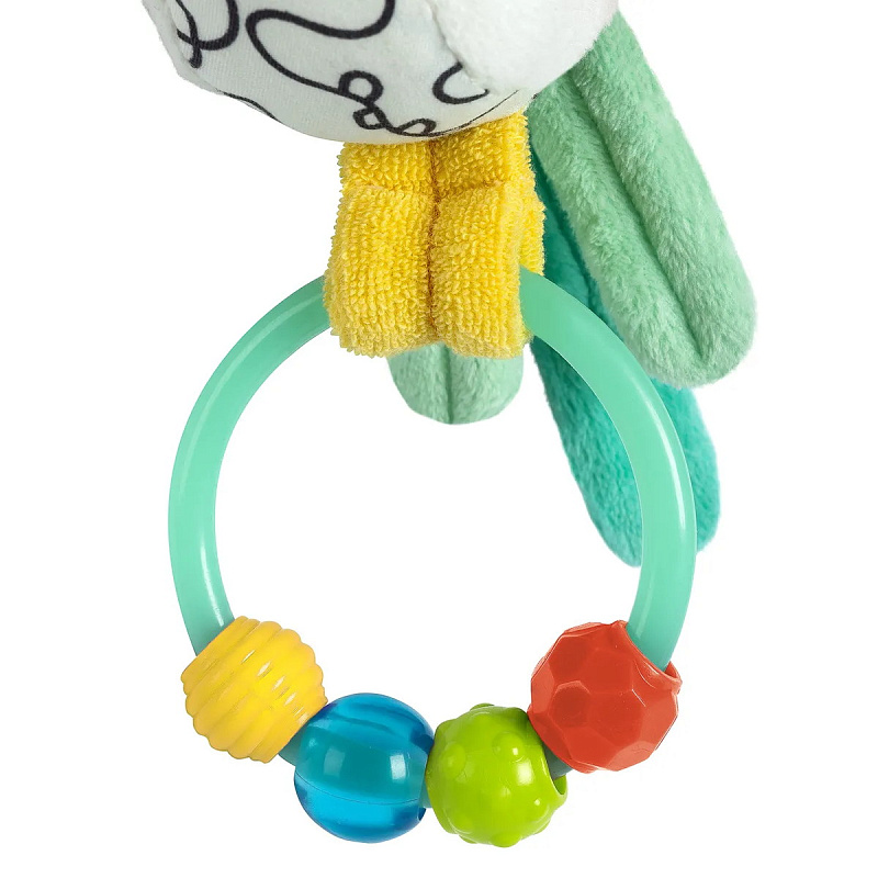 Красочные цвета стимулируют зрение ребенка, забавные чирикающие звуки тренируют слух. Колечко с бусинами, разнообразные на ощупь материалы и шуршащие элементы развивают мелкую моторику. Такая удивительная игрушка станет отличным подарком малышу на день рождения и на любой другой праздник.