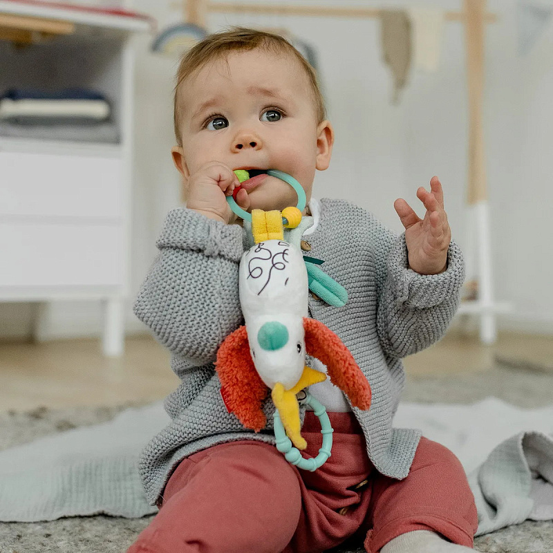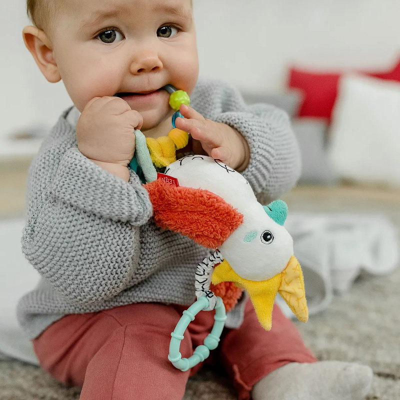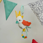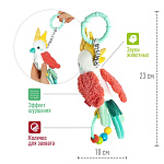Малыш будет тянуться за яркой, разноцветной птичкой и исследовать ее функции, развивая во время игры зрительно-моторную координацию, логику и хватательный навык.