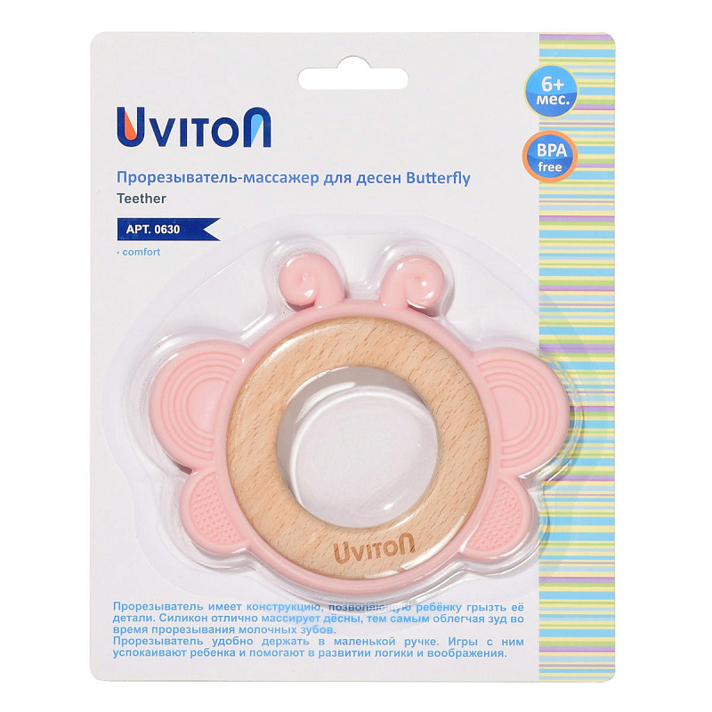 Прорезыватель силиконовый с элементами из натурального дерева бук Butterfly от Uviton не только выполняет свою основную функцию - помогает во время прорезывания зубов, но и предлагает разнообразные сенсорные ощущения благодаря сочетанию безопасного силикона и букового дерева.
