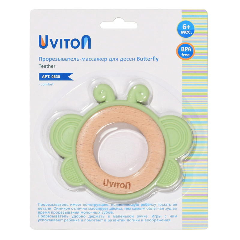 Прорезыватель силиконовый с элементами из натурального дерева бук Butterfly от Uviton не только выполняет свою основную функцию - помогает во время прорезывания зубов, но и предлагает разнообразные сенсорные ощущения благодаря сочетанию безопасного силикона и букового дерева.