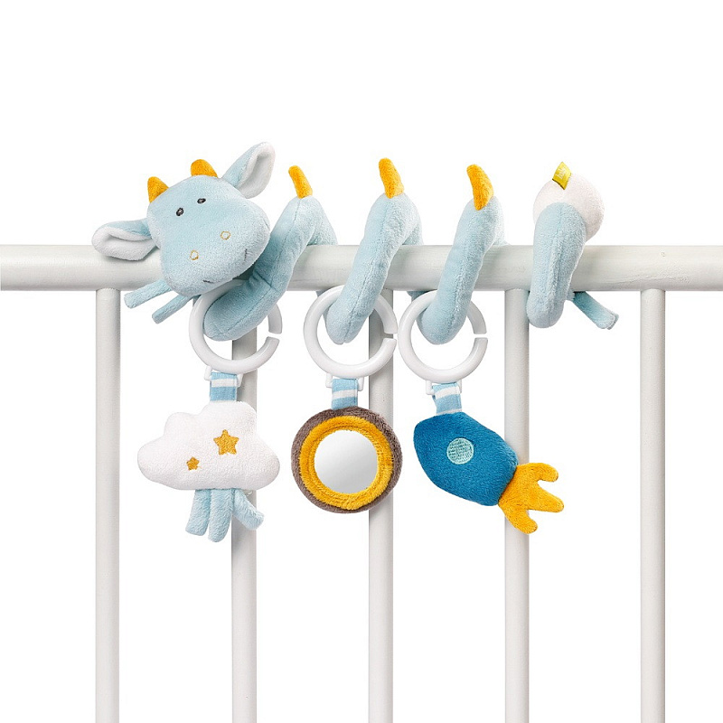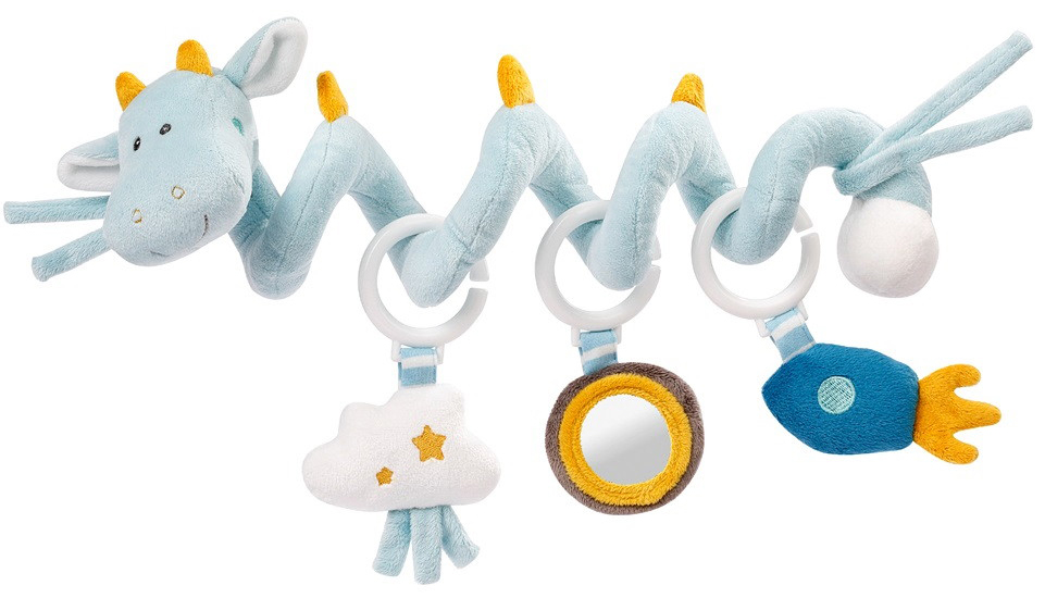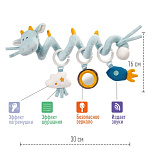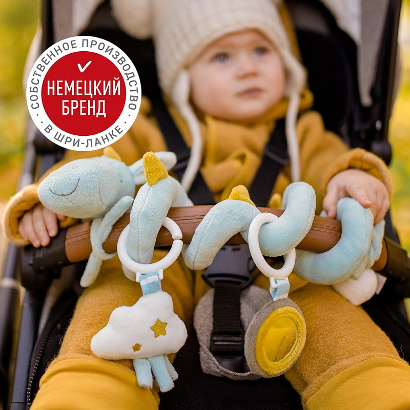 Очаровательный дракончик, выполненный в виде длинной текстильной спирали с подвесными мягкими игрушками. Идеально подходит для кроватки и манежа, коляски или автокресла.