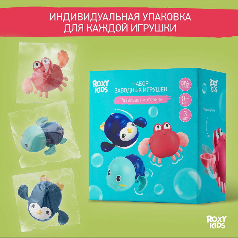 Игрушки для ванной Roxy-Kids заводные 3 шт RWIN-002 черепаха, краб, пингвин