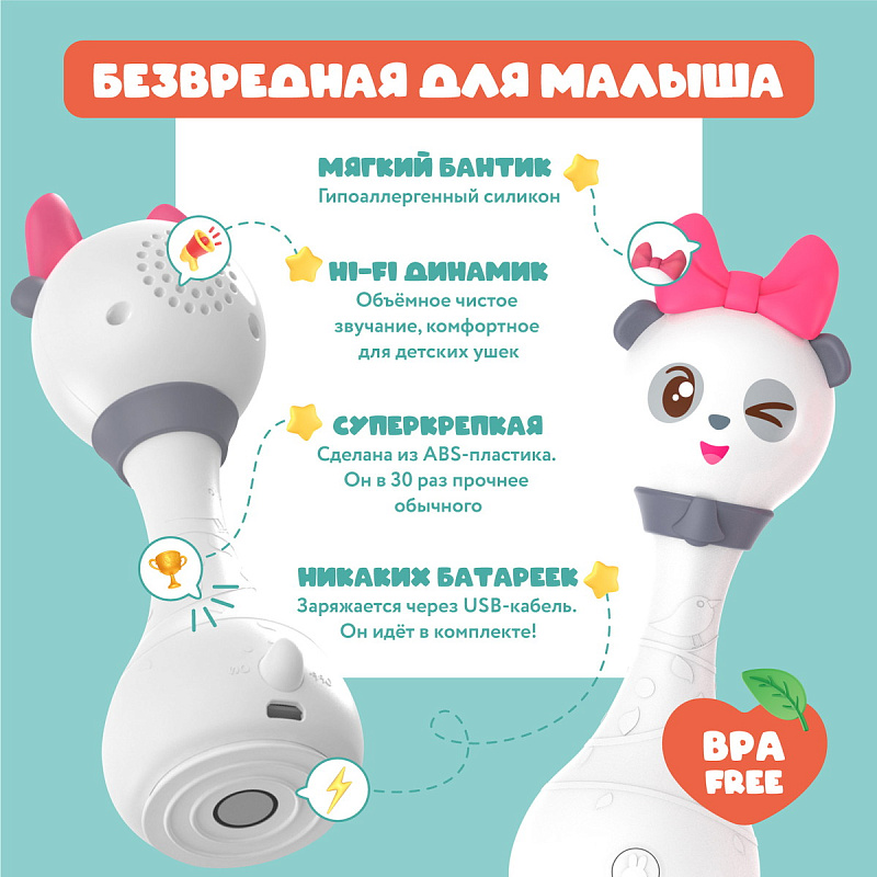 - Потрясите и она воспроизведёт 50 звуков из мира Малышариков.