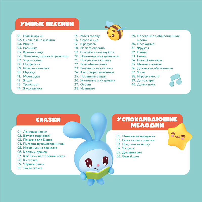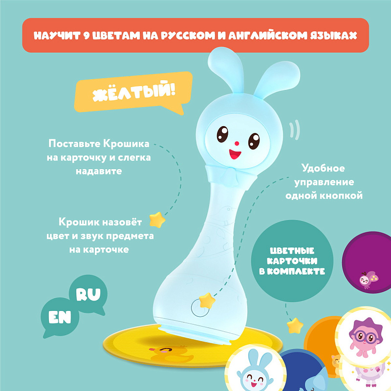 - Потрясите и она воспроизведёт 50 звуков из мира Малышариков.