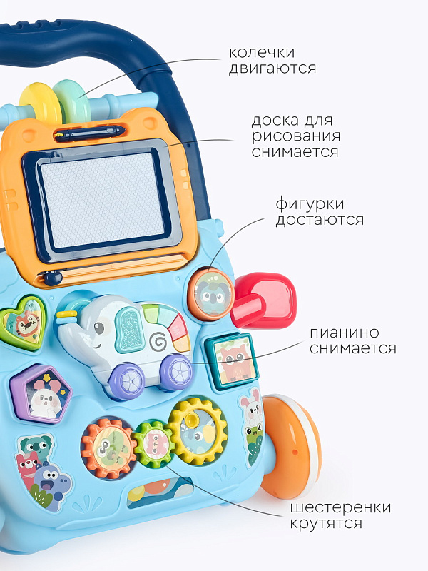 Ходунки-каталка оснащены множеством забавных и обучающих игрушек. Снимаемые игрушки позволят ребенку изучать формы и цвета, развивать мелкую моторику и фантазию.