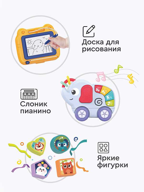 Один из самых увлекательных элементов игрушки – это музыкальный модуль-пианино. Он выполнен в виде забавного слоника с разноцветными клавишами и издает приятные звуки при нажатии. Играя с этим модулем, малыш сможет развивать слух и чувство ритма.