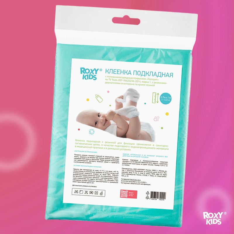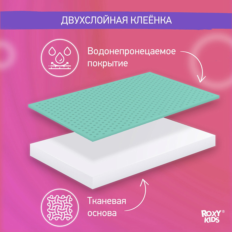 Подкладная клеенка для малышей ROXY-KIDS защищает детские матрасы и любую другую поверхность от загрязнения или протекания жидкостей. Она производятся из специальной медицинской клеенки с ПВХ-покрытием. Все клеенки имеют окантовку по периметру. Они обладают отличной теплопроводностью. Специальный покрывающий слой на основе поливинилхлорида делает поверхность пеленок удобной и комфортной, потому что она быстро приобретает температуру человеческого тела. Отсутствует эффект холодного прикосновения, что очень важно в педиатрии. Микропористая структура данного покрытия придает клеенке свойства газопроницаемости. В ассортименте ROXY-KIDS представлено несколько цветов подкладных клеенок.