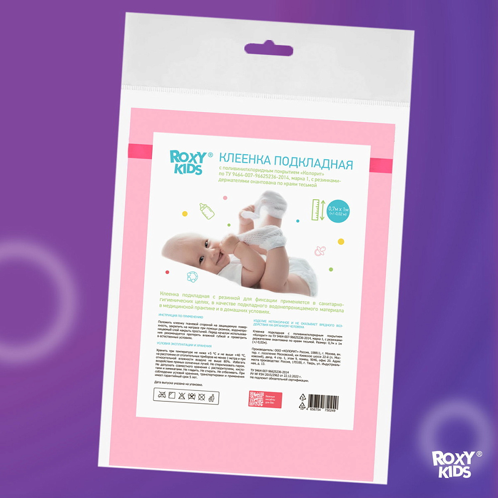 Подкладная клеенка с резинками-держателями защищает матрасы и любую другую поверхность от загрязнения или протекания жидкостей. Удобно крепится к детским матрасам с помощью резинок-держателей. Изделия ROXY-KIDS производятся из специальной медицинской клеенки с ПВХ-покрытием. Все клеенки имеют окантовку по периметру. Они обладают отличной теплопроводностью. Специальный покрывающий слой на основе поливинилхлорида делает поверхность пеленок удобной и комфортной - она быстро приобретает температуру человеческого тела. Отсутствует эффект холодного прикосновения, что очень важно в педиатрии. Микропористая структура данного покрытия придает клеенке свойства газопроницаемости.